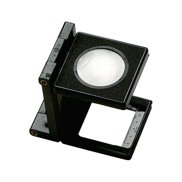 In Druckereien sehr beliebt. Aufklappbare Standlupe mit 5-facher Vergrößerung, 25 mm Linsenöffnung, 25 x 25 mm Gesichtsfeld und 25 g Gewicht.