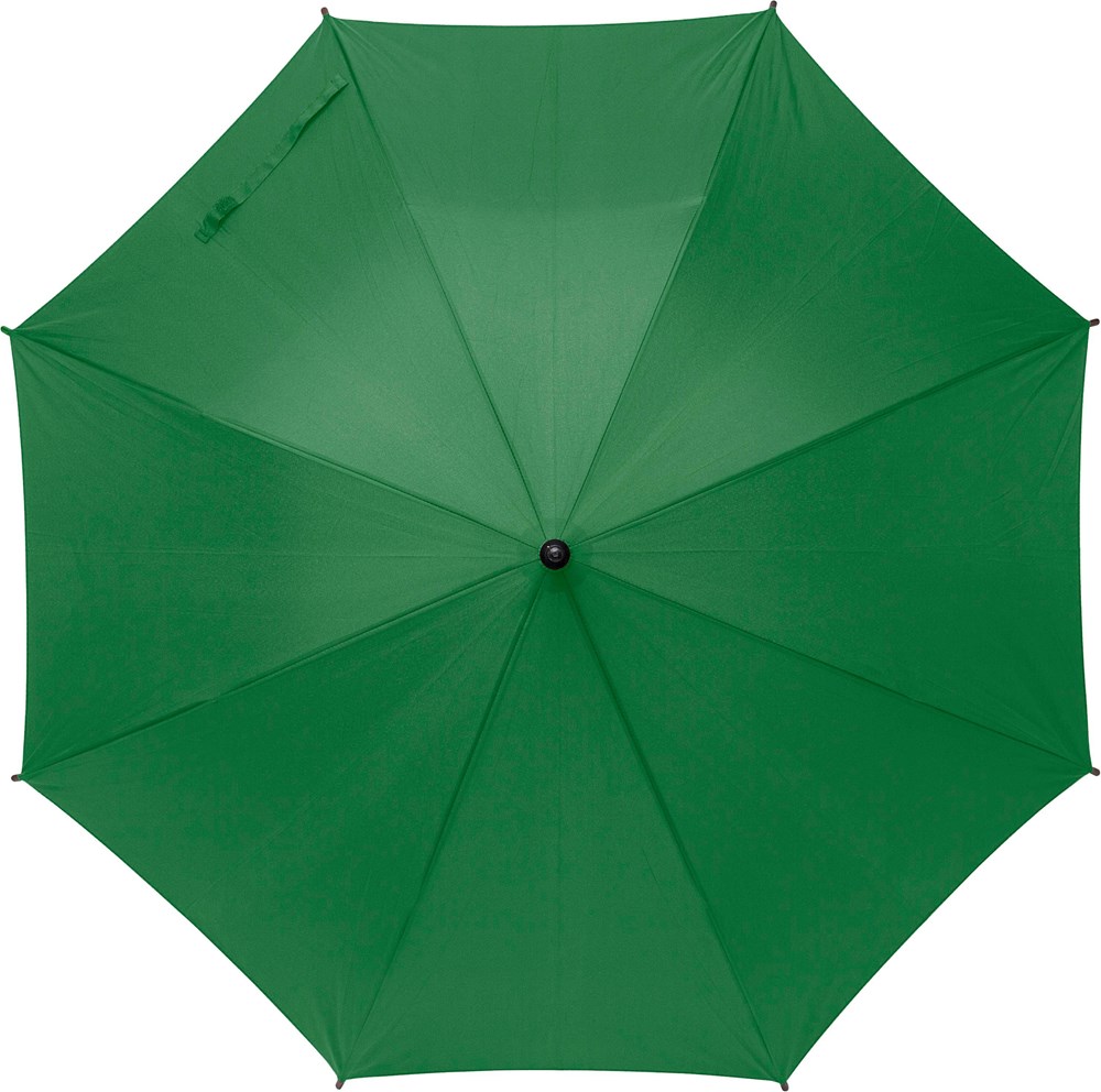 Regenschirm mit einer Bespannung aus rPET (170T), einen Handgriff aus Kunststoff und einen Rahmen aus Fiberglas.
